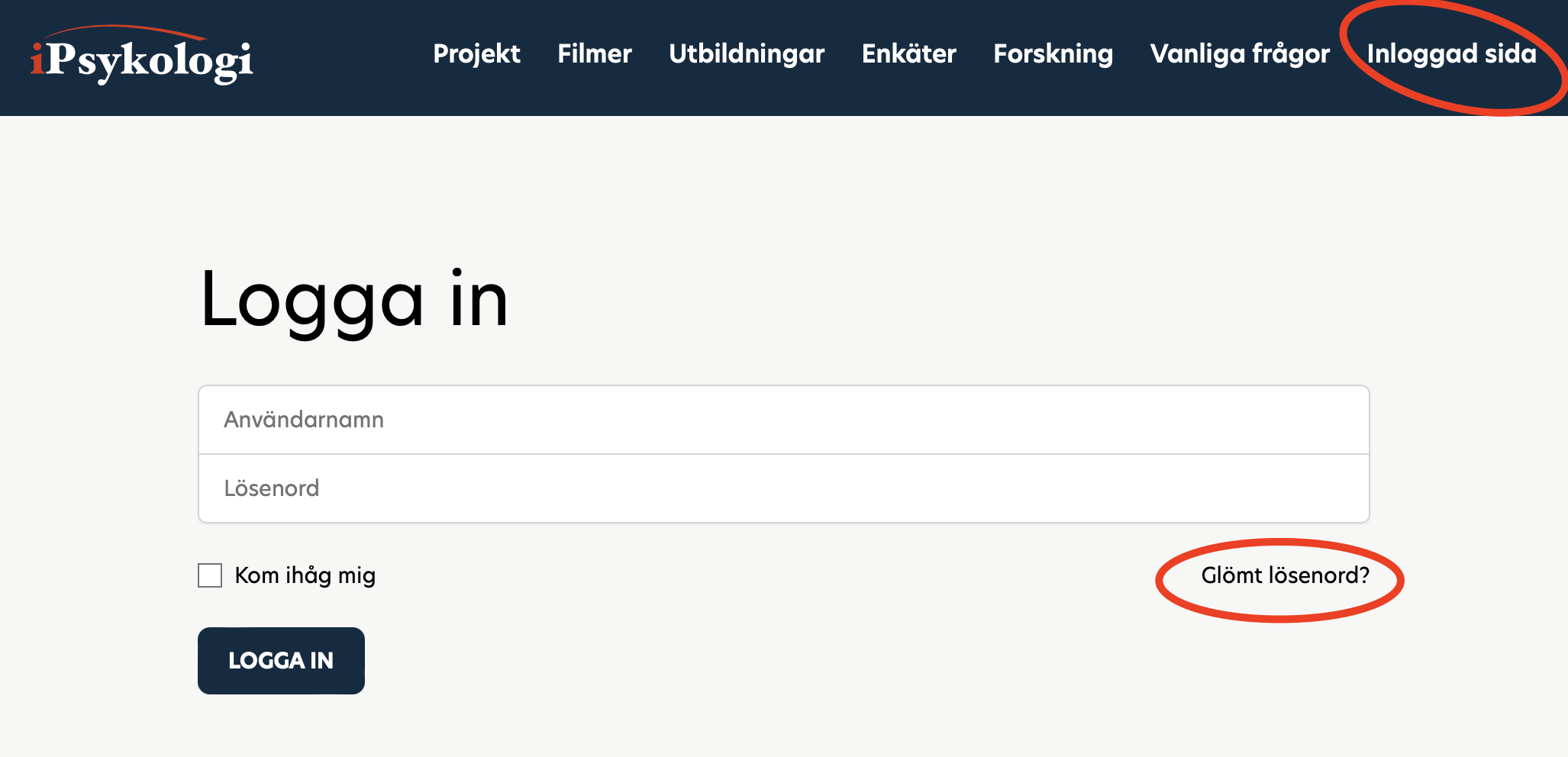 Klicka på "Inloggad sida" längst uppe till höger och sedan på "Glömt lösenord?"